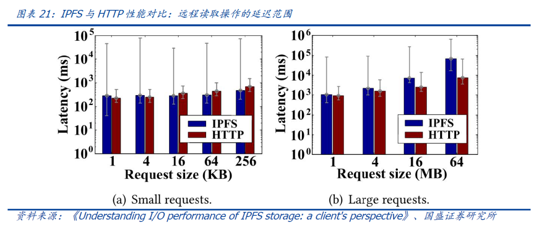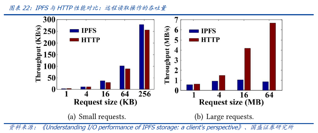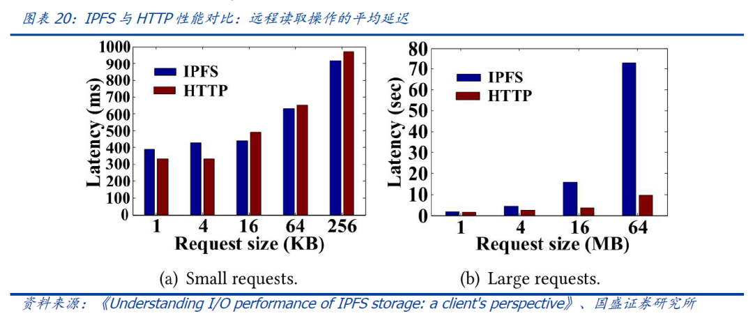 实验测试显示IPFS的I/O性能还有待进一步改善。由于采用分布式存储,文件的读取受到节点自身及全网其它节点的影响,主要包括:节点数量和稳定性、带宽、网络(地理)位置等。来自复旦大学的研究人员对IPFS的I/O性能做了一项实验,并和HTTP进行对比,以验证IPFS网络处理请求时的延迟和吞吐量表现。远程读取操作的平均延迟方面,当请求是小的请求时,在1k-4k间,HTTP延迟比IPFS低。遇到16-256k之间的文件,IPFS的延迟状况由于HTTP。当处理大文件请求时,IPFS在延迟上的表现不尽人意,尤其是请求大小朝贡16MB时,IPFS的处理时间接近了20秒。超过64MB时,延迟更是可以达到70秒,是HTTP(10秒)的7倍。当然,这是实验室测试条件下的结果,在实际应用过程中,尚未有具有说服性的案例;无论如何,IPFS等分布式存储方案若想替代HTTP等中心化方式,还有很多底层技术构架、协议和应用生态方面的改进与探索。