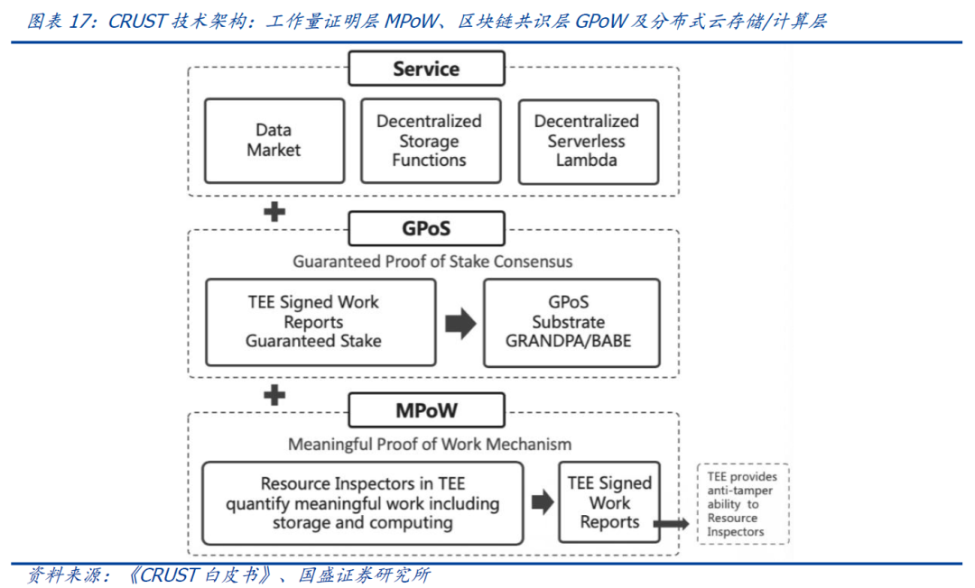 CRUST是基于有意义工作量证明机制(MPoW)和担保权益证明共识(GPoS)构建的数字加密应用层,同时也是一种支持去中心化存储与计算的新一代区块链技术。CRUST实现了去中心化存储的激励层协议,适配包括IPFS在内的多种存储层协议,并对应用层提供支持:第一层量化资源和工作量,提供了一个让所有人都能认可的计算方式MPoW,这是解决问题的根本;第二层利用GPoS达成共识,共同维护网络;第三层为用户提供去中心化的存储服务和检索服务,同时CRUST的架构也有能力对去中心化计算层提供支持,构建分布式云生态。