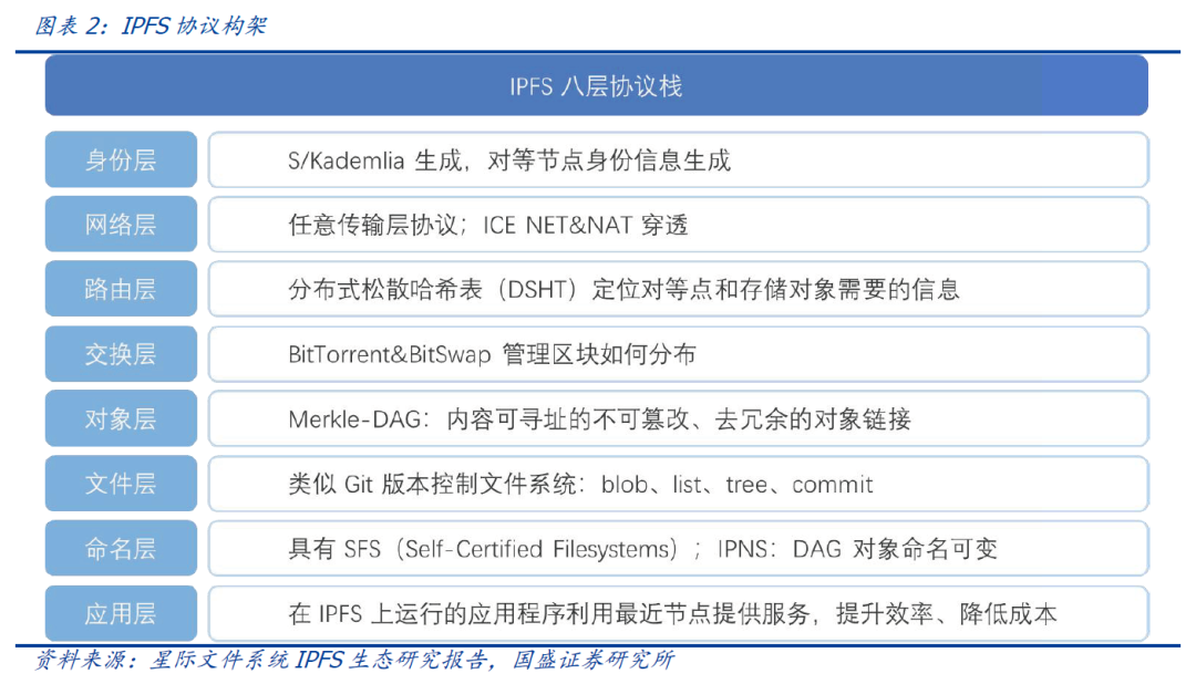 类似于于互联网的七层协议模型,IPFS构架分为八层子协议栈。IPFS作为分布式存储协议,核心功能包括:文件内容多人协调和版本可回溯、不可篡改,DHT管理带来的离散性、伸缩性和良好的容错性,以及基于IPNS的文件域名系统。