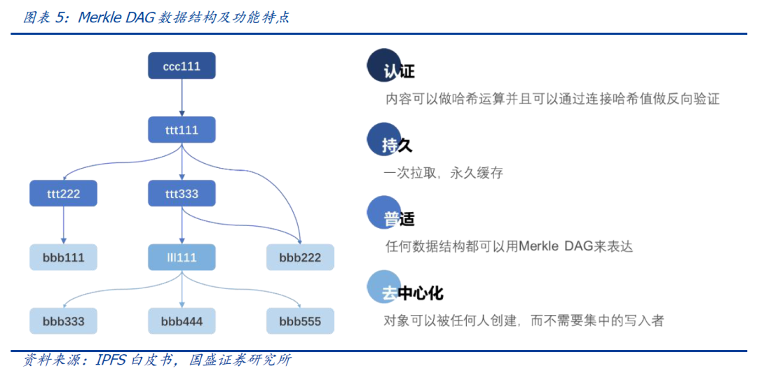 IPFS团队对Git数据结构进行改造,在Merkle Tree的基础上得到了Merkel DAG,拥有内容寻址、防篡改、去重三大功能。IPFS将文件划分成单个大小不超过256kB的数据块,每个数据块拥有唯一的哈希值,并构造一个Merkel DAG将所有文件碎片组织起来。Merkel DAG是实现版本化文件系统的一种核心数据结构,比Merkle Tree的限制更少,但是保留了其两点精髓:1)父节点哈希由子节点哈希决定,即父节点哈希由子节点哈希拼接的字符串再次哈希而成;2)父节点中包含指向子节点的信息。任何一个下层节点的改动都将导致上层节点哈希值的变动,最终根节点的哈希值也将变动,因此Merkle DAG的三大功能得以实现:1)内容寻址:使用多重哈希来唯一识别一个数据块的内容;2)防篡改:数据接受方只需一段Merkle路径上的哈希值,就可以检查数据是否被篡改;3)去重:内容相同的数据块的哈希是相同的,可据此删除重复数据,节省存储空间。
