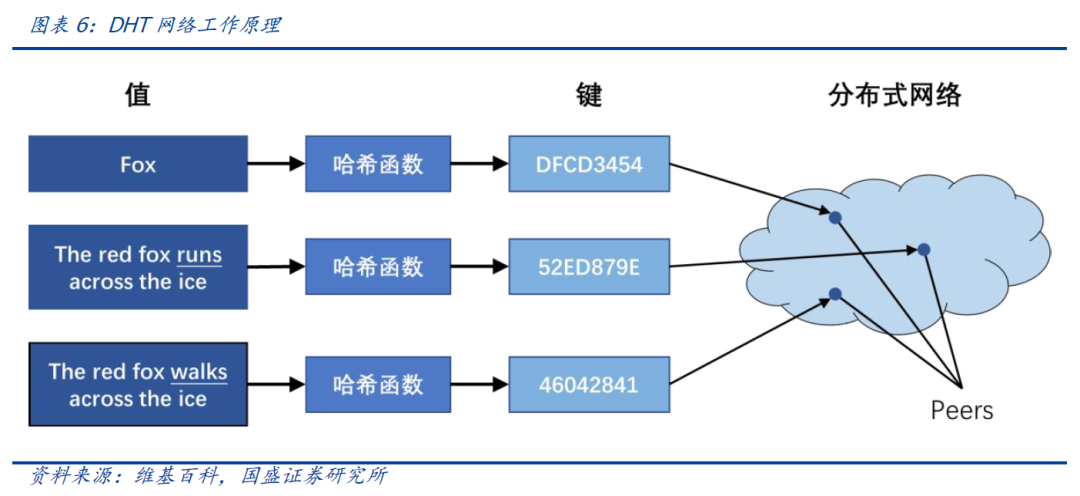 IPFS的路由功能采用分布式哈希列表DHT,帮助客户节点快速找到所需数据所在的节点,具有离散性、伸缩性和良好的容错性。DHT是一种分布式哈希表,通过存储的键值对提供查询服务:键值对存储在DHT中,节点可以检索给定键对应的值,键值对的映射由网络中所有的节点维护。在不需要服务器的情况下,每个节点负责一小部分路由和数据存储,从而实现整个DHT网络的寻址和存储。即使有节点加入或离开,对整个网络的影响也很小,因此DHT可以扩展到非常庞大的节点(上千万)。DHT具有以下性质:1)离散型:构成系统的节点之间都是对等的,没有中央控制机制进行协调;2)伸缩性:不论系统有多少节点,都要求高效工作;3)容错性:不断有节点加入和离开,不影响整个系统的工作。