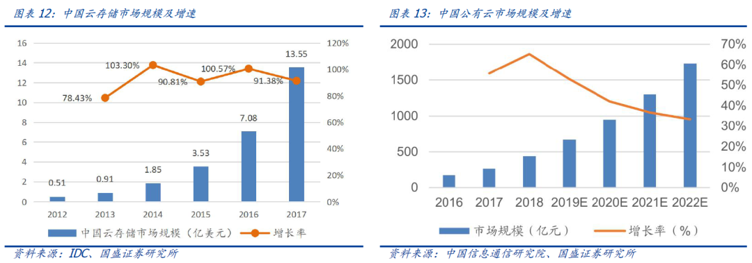 根据云存储服务性质的不同,可以分为公有云、私有云和混合云。其中,公有云面向包括个人、家庭、企业在内的多种客户;私有云由企业或组织使用及维护,用户在个性化等方面有更多的控制权;混合云将公有云和私有云进行混合和匹配,达成相对高性价比解决方案。据IDC预测,2025年中国数据规模将达到48.6ZB,其中超过80%为非结构化数据,且由于发展滞后北美4-5年,中国云市场增速高于全球水平。2018年中国云计算整体市场规模达962.8亿元,增速为39.2%。其中,公有云市场规模达到437亿元,增速为65.2%,预计接下来三年内仍将快速增长。