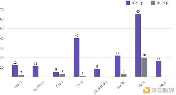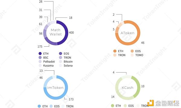 在数据统计时,各项钱包官网披露的公链数目较为模糊,TokenInsight采取枚举审核的方式,逐一确认在其App中确切的支持公链数目。其中支持数目最多的Math Wallet也是19年时候支持公链最全的钱包。