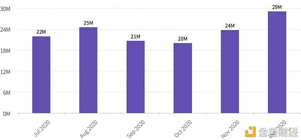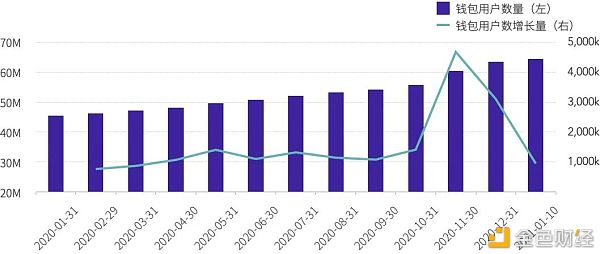 “ 整体市场热度方面,2020年全球钱包用户稳步增长,增长速度趋于平缓,10月,11月有小幅上涨;在用户访问量方面,12月访问量增幅超过30%