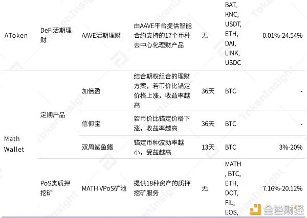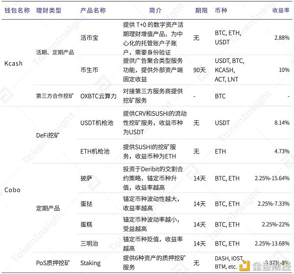 各钱包理财产品功能介绍,来源:TokenInsight,统计截止日期2021年1月10日