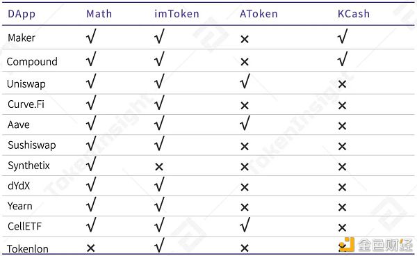 而同样具备DApp浏览器功能的Math Wallet并没有按照不同公链将应用进行分类,而是采取了功能性分类的方式,将已对接的应用按照DeFi、CeFi、交易、工具、数据等进行分类。经历2020年的火速发展,DApp生态已展现出超预期的活跃程度。以MakerDAO,Compound和Uniswap为首带领的DeFi稳定币、借贷和交易所板块已逐渐成熟。因此钱包在DeFi热点布局也十分积极。TokenInsight统计了Math、imToken、AToken和KCash钱包对最火热的前十名DeFi项目对接情况。