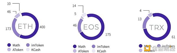 其中Math和imToken浏览器对不同公链均进行了DApp应用分类,包含ETH2.0质押服务到游戏、社区等应用7种。在Math钱包对接的65条公链中,ETH应用大于400个,EOS上为175个,TRON上98个,成为在所有钱包中,DApp对接最为丰富的钱包。