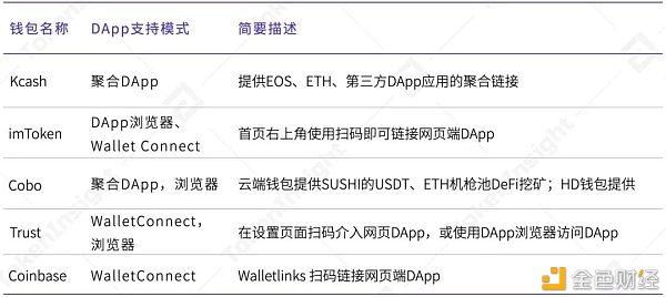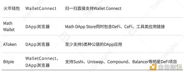 6. 越来越多的钱包集成了连接 DApp 和手机钱包的WalletConnect 功能,为用户在DeFi应用中交易、转账提供通道。
