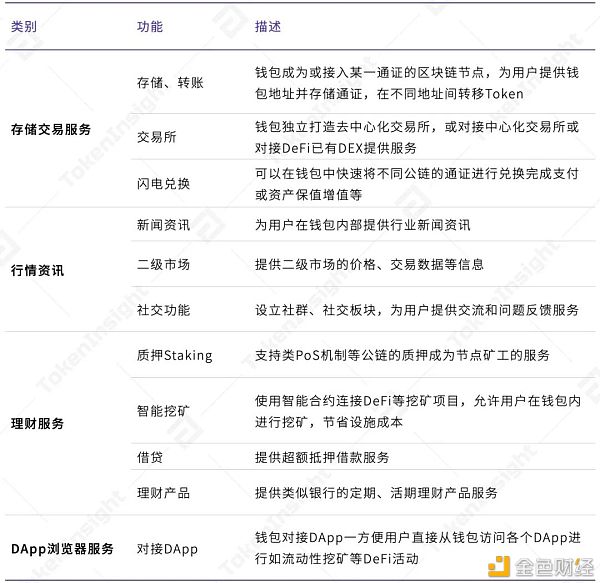 TokenInsight 针对钱包的不同功能服务,将其分为存储与交易服务、行情资讯服务,理财产品服务,DApp浏览器服务四个种类。