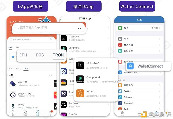 三种DApp接入方式展示,来源:imToken, KCash, Trust Wallet, TokenInsight