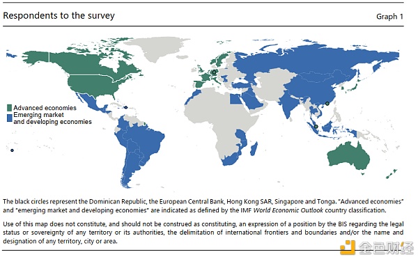 该调查于2020年第四季度进行。问卷内容包括央行目前对于CBDC的进展,动机和期望等问题。到2020年,有65家央行答复了该调查10。受访者代表了近72%的世界人口,占全球经济产出的91%。21个受访者位于发达经济体(AE),44个位于新兴市场和发展中经济体(EMDE)。