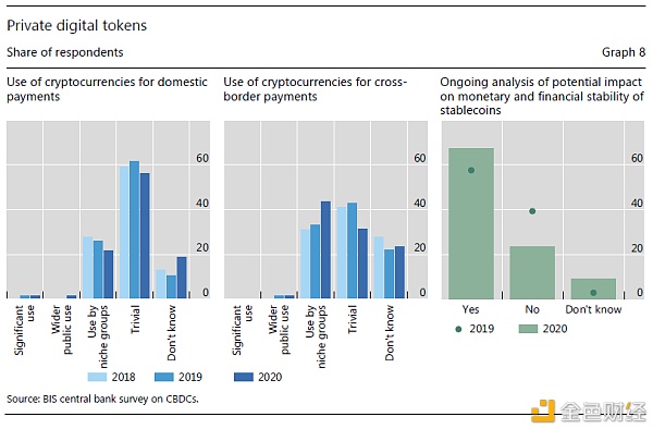 具体而言,调查还询问了中央银行关于国内和跨境支付中加密货币当前和预期的使用情况,大多数答复表明,与国内和跨境层面,利基产品使用情况较少。也有一些例外:在公共机构信任度低的特殊情况下,加密货币通过科技保持价值稳定,从而在国内支付中发挥更广泛和重要的用途。同时,大多数货币当局正在对稳定币进行分析。根据调查,三分之二的中央银行正在研究稳定币对货币和金融稳定的影响。值得注意的是,与一年前相比,更多的发展中国家中央银行已开始调查稳定币,这可能反映出人们对广泛采用的稳定币对跨境影响的认识日益提高。那些未对稳定币进行评估的地区大多是小型的发展经济体,其对CBDC的研究更为活跃。