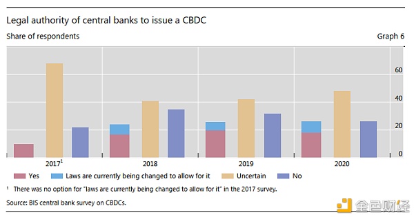 健全而明确的法律框架是发行CBDC的基本前提。与前两次调查一样,大约四分之一的中央银行拥有或即将拥有发行CBDC的法定权力。