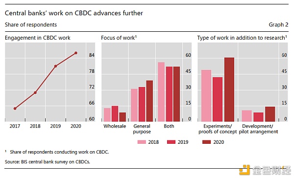 在2020年Covid-19大流行期间,关于CBDC的工作仍在继续进行。调查中的绝大多数中央银行(86%)正在探索CBDC的利弊。近几个月来,大多中央银行已经发布了许多深入的政策评估,并测试了各种设计方案。