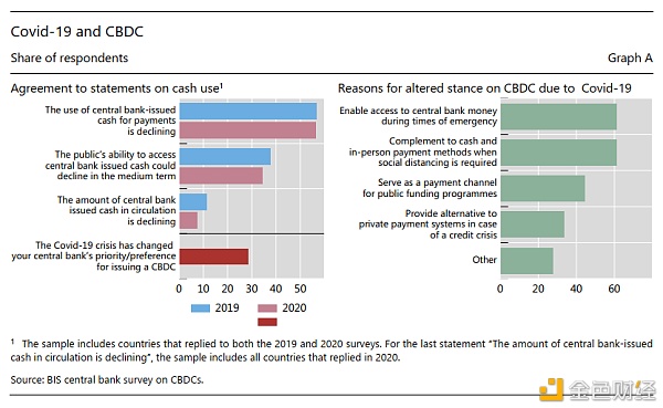 调查显示,总体而言,中央银行试图在紧迫性和谨慎性之间取得平衡并更加倾向于谨慎性。大约60%的中央银行表示,危机并未改变其发行CBDC的偏好。对于那些因Covid-19而改变了对CBDC立场的中央银行,主要原因是为了在紧急情况下能够获取中央银行的资金,并将在需要社交距离时利用CBDC作为现金和现金的潜在补充。使用CBDC作为政府向个人付款的方式(尤其是直接向家庭和小型企业提供财政援助或刺激)的想法也得到了广泛认可。