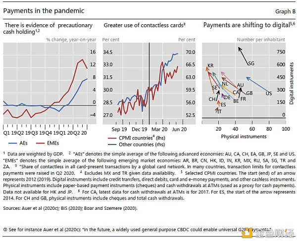 在大多数司法管辖区中,央行发行的流通现金数量并未减少,同时,许多地方报告称,用于支付的现金正在减少。一方面,这些趋势反映了出于预防目的和作为价值存储而持有现金的需求。另一方面,这表明在疫情期间,零售支付发生了显著变化。应当指出的是,随着消费者从实物支付方式向数字支付方式的转变,这两个方面都对现有趋势进行了验证。
