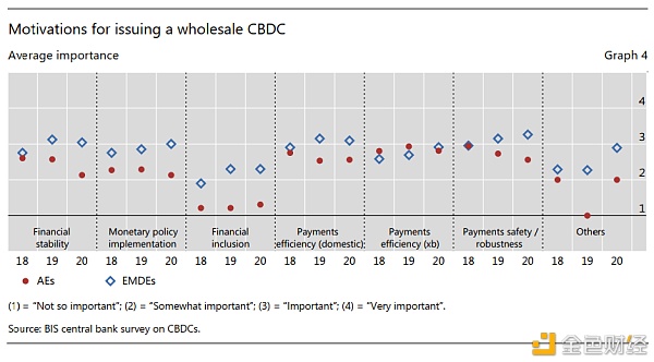 与支付相关的动机(例如国内支付效率和支付安全性)仍然是发达国家和发展中国家发行零售CBDC的核心动机。