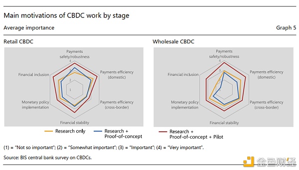 平均而言,批发CBDC的动机比零售CBDC的动机更强的唯一领域是跨境支付效率。如前所述,正在进行的中央银行实验强调了这一评估,并将作为为了加强跨境支付的国际合作的一部分进行更深入的研究。