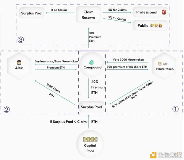 inSure 生态系统中共有两个资金池,Capital Pool 和 Surplus Pool。Capital Pool 用来支持业务发展,资金提供者将会获得 inSure tokens 作为回报。Surplus Pool 用来存放保险的保费。在支付索赔时,Surplus Pool 将会首先支付,当 Surplus Pool 里的资金不能够达到最低资金标准(Minimum Capital Requirement) 时,Capital Pool 中的资金提取交易将会被冻结;而当 Surplus Pool 里的资金不能够支付所有的索赔时,Capital Pool 会支付剩下的部分。