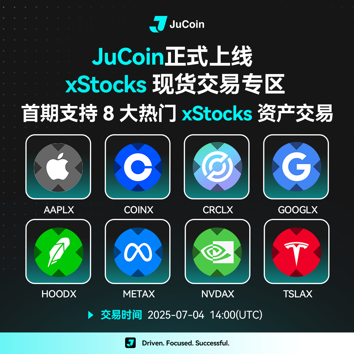 JuCoin officially launches the xStocks spot trading section, which initially supports 8 popular xStocks assets for trading, namely AAPLX, COINX, CRCLX, GOOGLX, HOODX, METAX, NVDAX, and TSLAX, providing global users with a convenient and efficient on-chain xStocks trading channel.