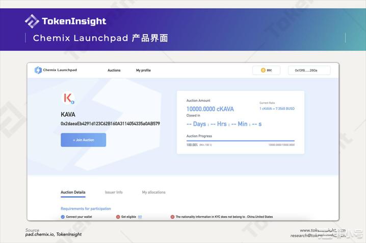 - Chemix Launchpad,以 QSD 超额抵押的方式提前合成一些未上市的代币资产或链上锁定资产并以荷兰式拍卖等方式进行类似于 IDO 的交易,交换 token 的未来收益权,提前释放流动性。8月23日18:00(UTC+8)Chemix Launchpad 在 BSC 主网已开启第一场 cKAVA 的荷兰式拍卖。