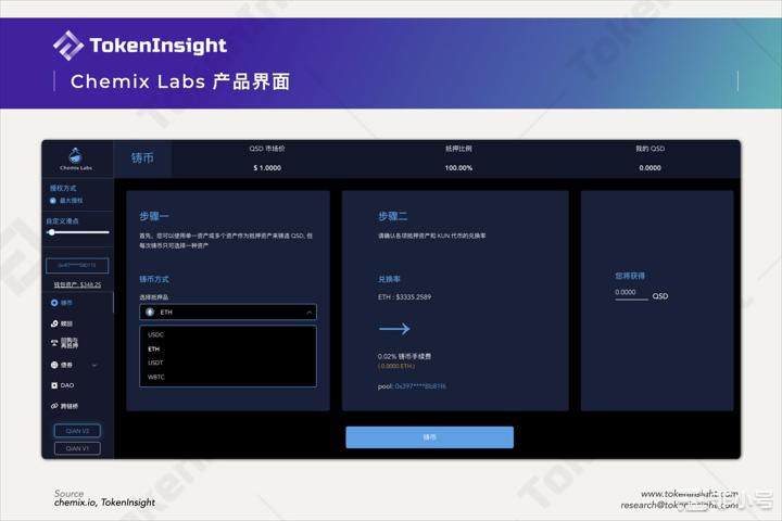 QSD 是基于 Chemix labs(分数算法型合成资产协议)发行的部分抵押型美元稳定币,其核心机制采用"部分抵押"和"算法调节"思路,即由部分资产质押和部分算法币燃烧共同支撑其价值,区分于超额抵押率思路,该机制可有效提高资金利用率和资金吸纳能力。目前Chemix labs 同时支持以太坊和 BSC 网络。