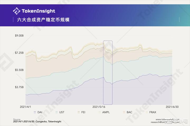 上图为第二季度美元合成资产市场规模,总体趋势来看头部稳定币项目市场供应量逐渐增大,其背后推动力无疑是对美元合成资产的市场需求量增加。但不可忽视的是,图中5月19日合成资产稳定币市场规模急剧下降,以 ETH 作为质押资产的 DAI 为例,当日以太坊市场价格大幅下跌,基于以太坊的合成资产质押率不足而导致的清算风险出现,因此合成资产之下的基础资产所引发的风险需着重思考。