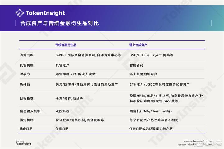 - 拓展资产。合成资产提供了一种新的机制,能够让真实世界的资产在某个区块链(通常为拓展性好且有用户基础的区块链,如 ETH 和 BSC 等)上交易。