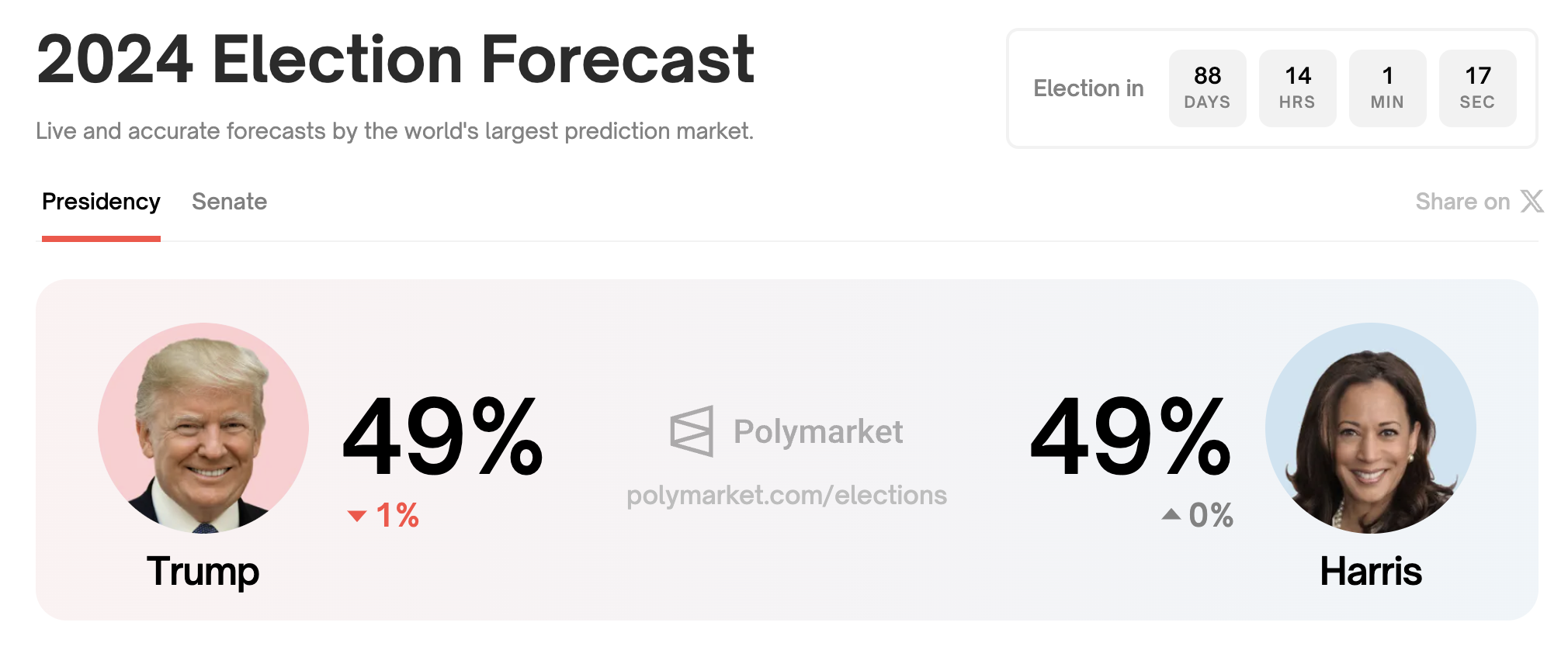 市场风向似乎正在转向哈里斯,在基于加密货币的预测市场 Polymarket 之上,哈里斯的获选概率现已追平特朗普,甚至一度实现了反超。