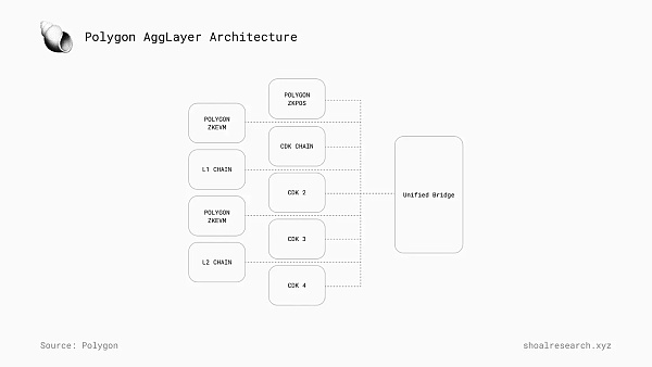 Polygon 正在开发 AggLayer,这是一个使用 Polygon CDK 为 L2 构建的统一跨链桥,可以聚合 zk 证明并统一提交给以太坊进行结算。在这种模式下,所有链都与其他受支持的 AggLayer 链共享一个跨链合约,可在保持独立性的情况下获得更多流动性,使早期网络的启动更加容易。