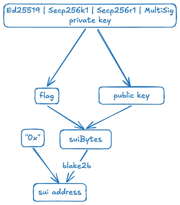 为了派生一个 32 字节的 Sui 地址,Sui 使用 BLAKE2b(256 位输出)哈希函数将签名方案标志(1 字节)与公钥字节连接起来。Sui 地址当前支持纯 Ed25519、Secp256k1、Secp256r1 和 MultiSig,对应的标志字节分别为 0x00、0x01、0x02 和 0x03。