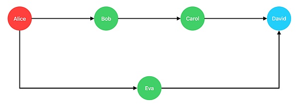 以 Alice 向 David 支付 2000 聪为例,假设他们之间没有建立支付通道,不过 Alice 和 Bob 之间、Bob 和 Carol 之间、 Carol 和 David 之间都已经建立了支付通道。在这种情况下,Alice 可以先把钱转给 Bob ,再由 Bob 转给 Carol,最后 Carol 转给 David,这样看起来就实现了从 Alice 到 David 间的支付通道,其中 Bob 和 Carol 充当了网络中的路由节点。如果 Alice 和 Eva 之间、Eva 和 David 之间也建立了支付通道,那么 Alice 也可以选择先把钱转给 Eva,再由 Eva 转给 David。