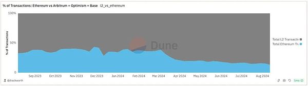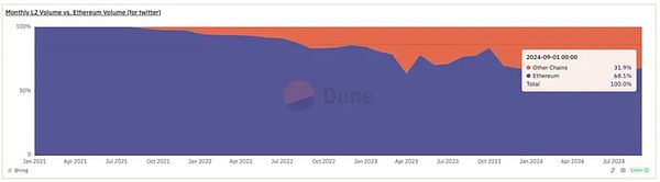 目前以太坊L1仍承载着整个生态超过一半的交易量。而长期来看,以太坊更类似提供了一种高度去中心化自治、抗审查、安全性最高的无许可发行L2的平台(结算层)。