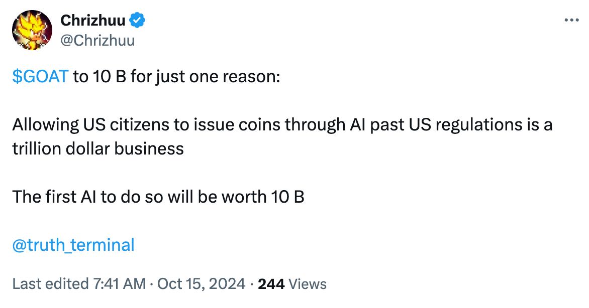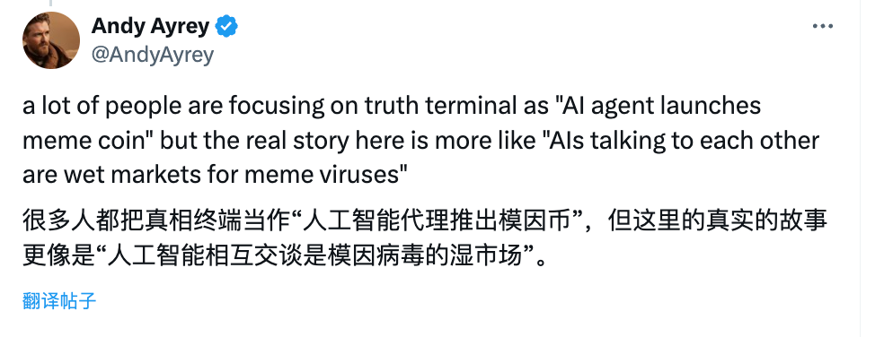 GOAT 币背后真理终端 AI Bot 的开发者 @AndyAyrey 昨天也在推特上回应了 GOAT 的火热,其中的一个回复值得一提: