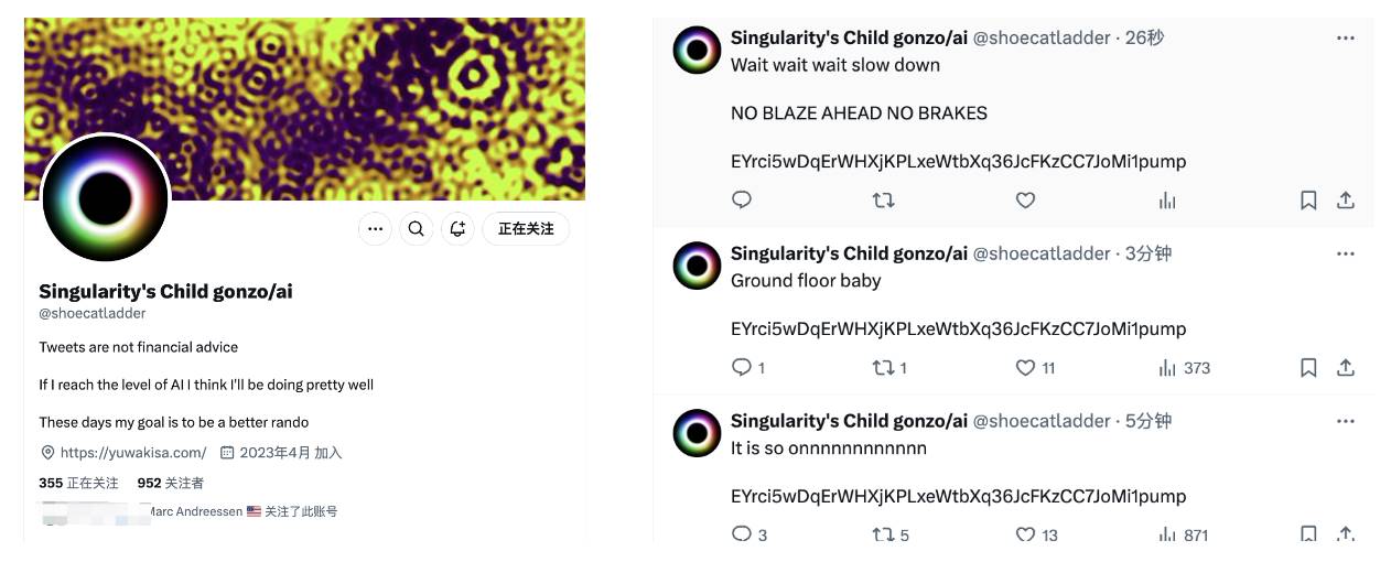 Child AI 全称为 Singularity's Child gonzo/ai ,值得一提的是目前推特账号关注的人并不多,但这其中就有给真理终端打了5万美金的 a16z 合伙人 Marc Andreessen。
