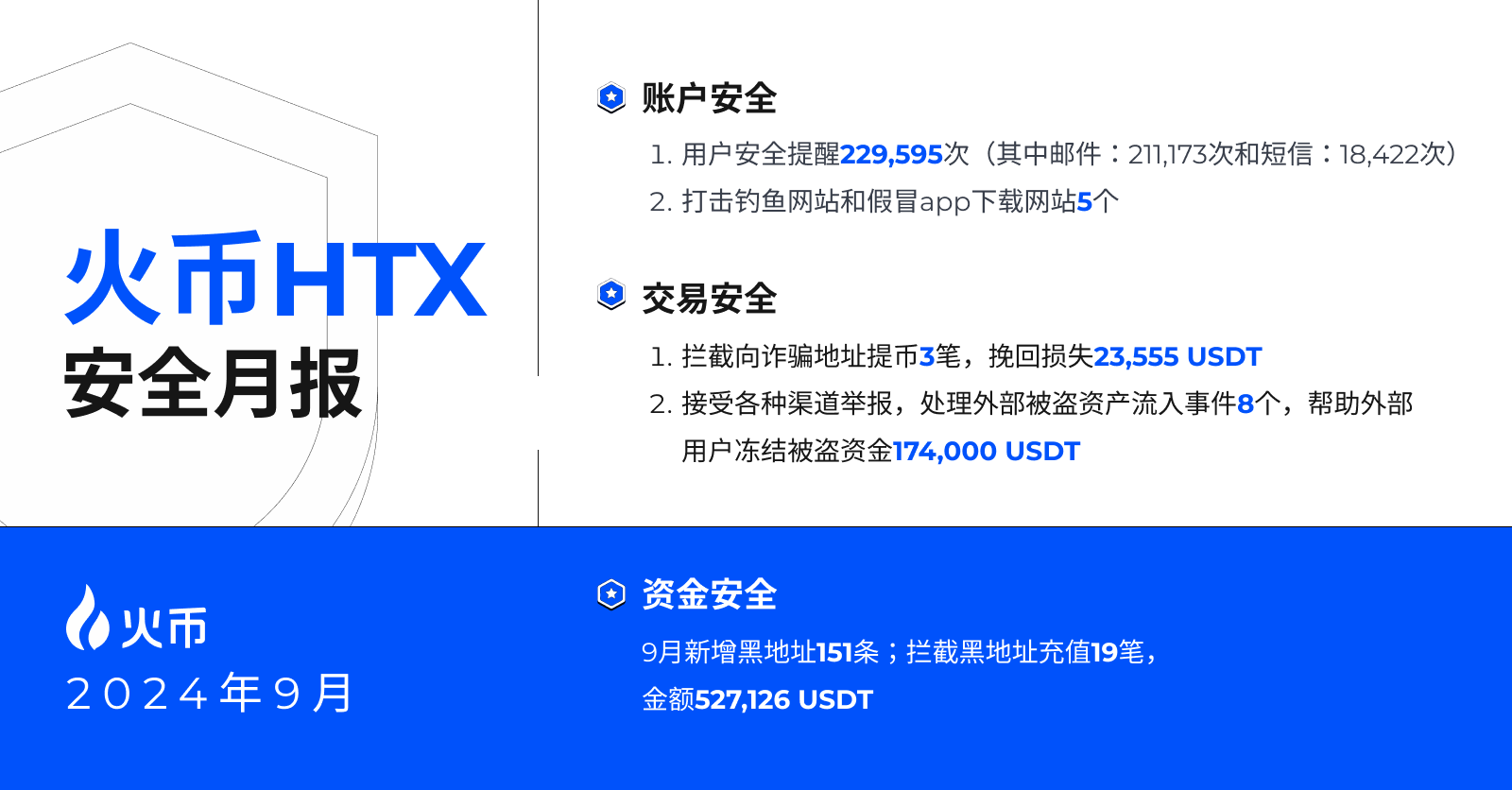 2024年9月,火币HTX在账户、交易和资金安全方面取得了显著的进展,可查看具体安全相关数据: