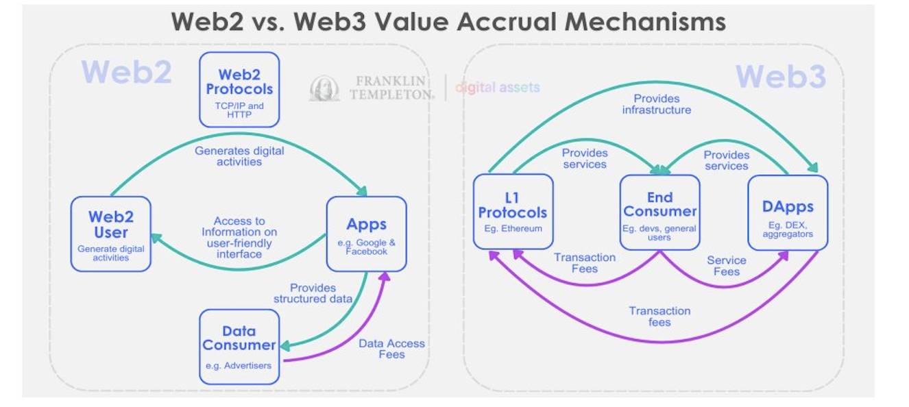 Web3 与 Web2 的历史价值获取机制存在重大背离。与 Web2 不同,Web2 的价值生成主要源于在基本协议之上开发消费者友好型产品,而 Web3 直接从基本协议中获取价值。第 1 层协议 (L1) 促进了这种交易被包含进区块,使它们能够通过收取用户愿意为执行支付的交易费用来货币化该过程。