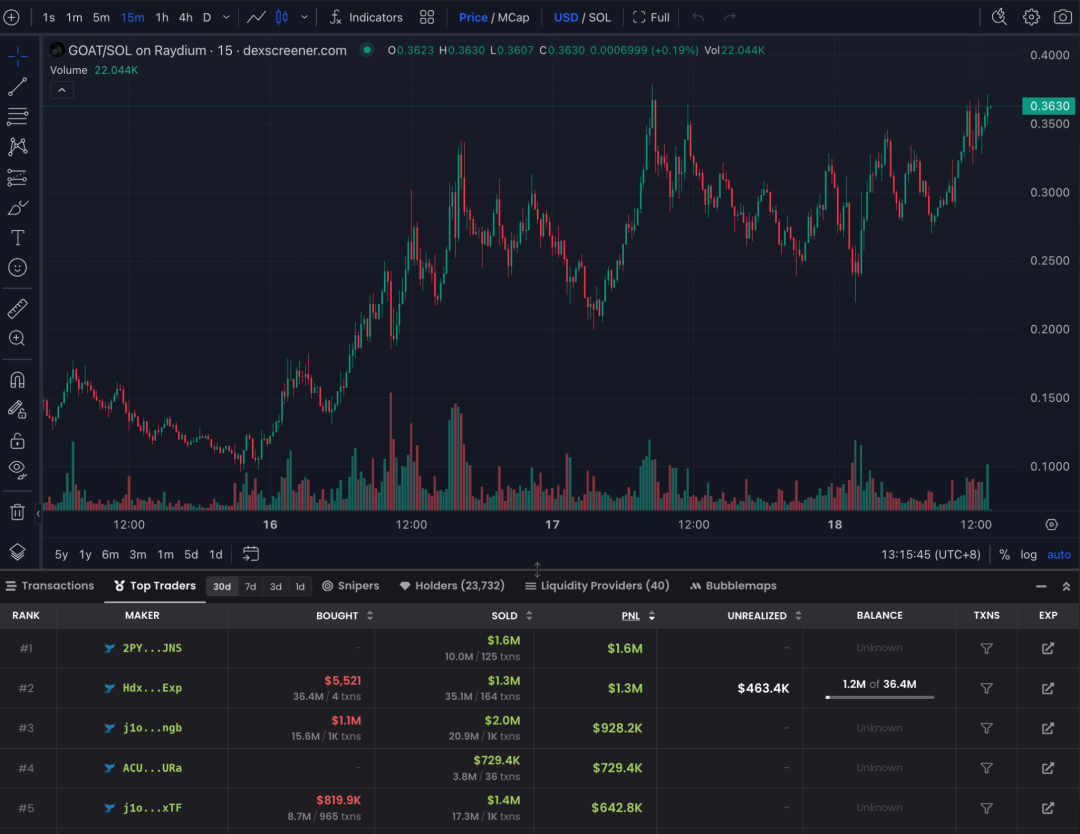 1. 挑选一个近期的热点 Meme 币,比如 $Goat,打开 Dexscreener 里的对应 $Goat 的 Top Traders,寻找那种内幕钱包,就是投入少但是收益很高的钱包。