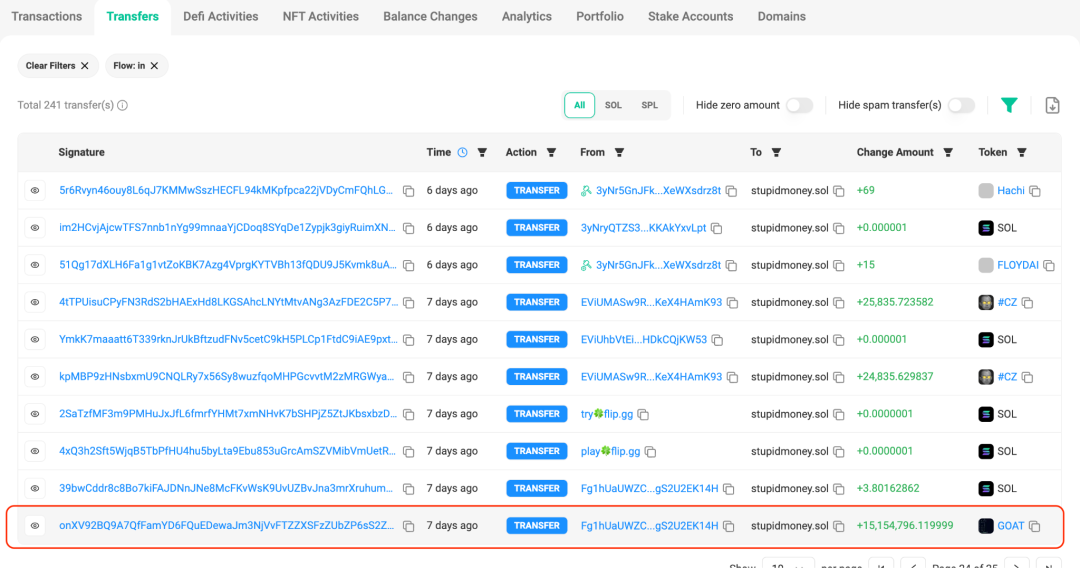 通过 Solscan 区块浏览器可以观察该地址交互情况,发现 Goat 代币是从另一个地址转账过来的