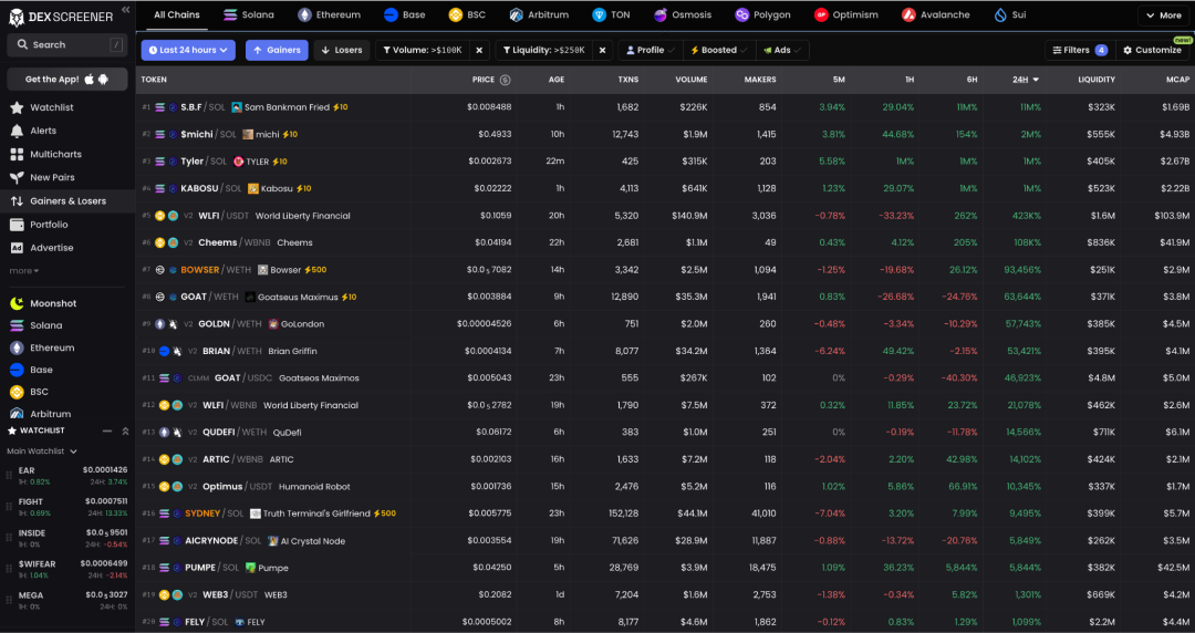 1. 寻找资金土狗交易活跃的链,先打开 Dexscreener(这是目前免费且非常好用的工具),左侧栏选择 Gainers & Losers,观察过去 24 小时涨幅前 20 的代币在什么链上,再统计一下前 20 里最多的是哪条链。比如下图,涨幅靠前的代币最多的链是 Solana。