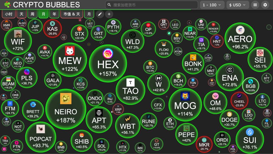 如图所示,月度统计涨幅靠前的大气泡有许多都是 Meme 币