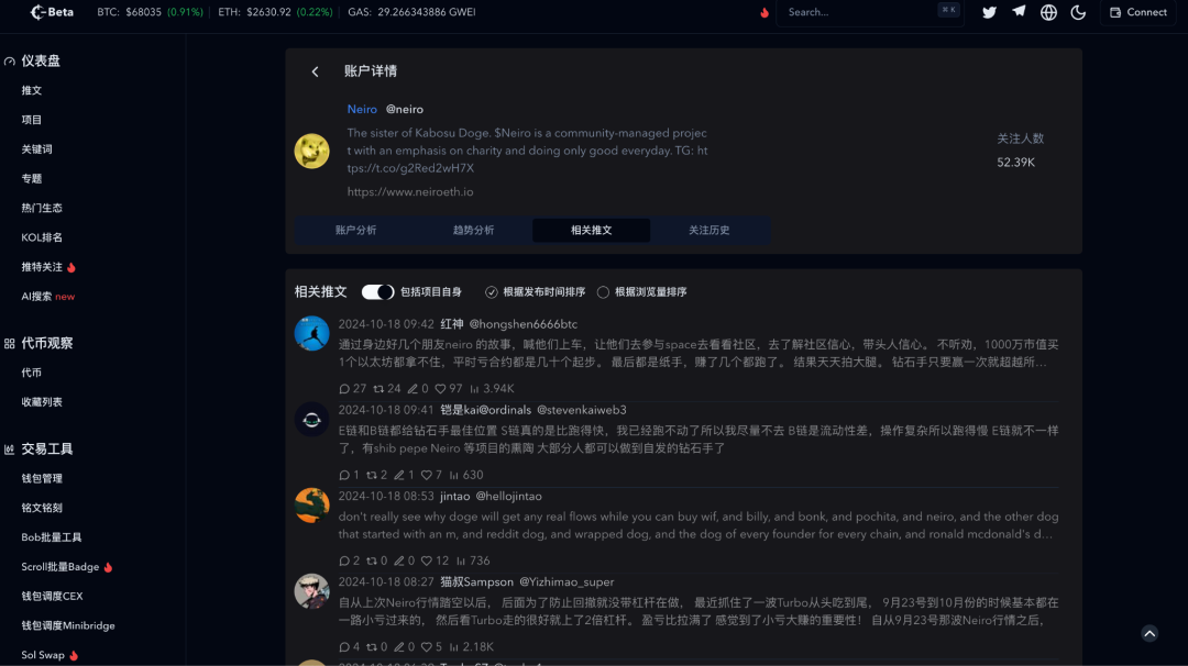 通过 Cryptohunt 了解相关代币推特 KOL 关注度、相关推文、趋势分析等情况
