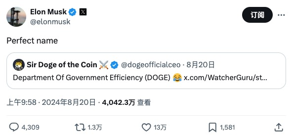 而D.O.G.E这个名称的来源,也确实来自于DOGE社区。马斯克与8月20日在官方X账户中回复了@Sir Doge Of the coin的内容,这个名字应该为其设计该部门名称提供了灵感。