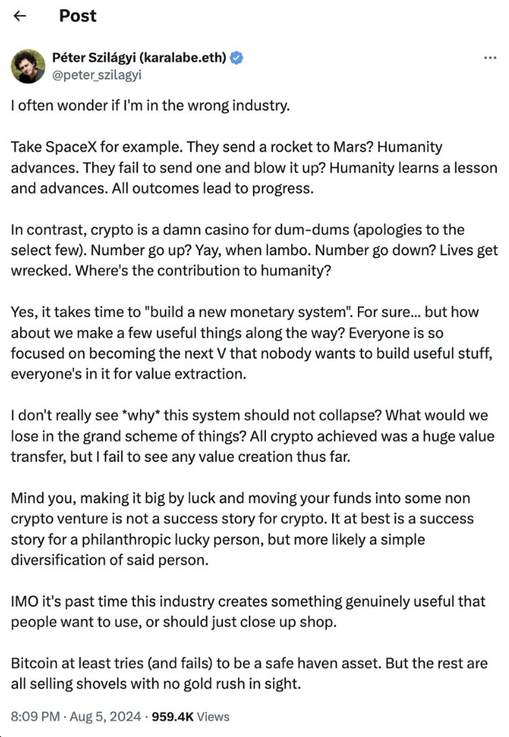 写下这篇前言时,距离 Casino on Mars 的发表已将近一年,市场仿佛再度陷入了相似的沉寂时刻。Péter Szilágyi 近期一条「自我反思」的推文也引发了一场「关于加密存在意义」的行业级辩论。他直言:「It's past time this industry creates something genuinely useful that people want to use, or should just close up shop.」