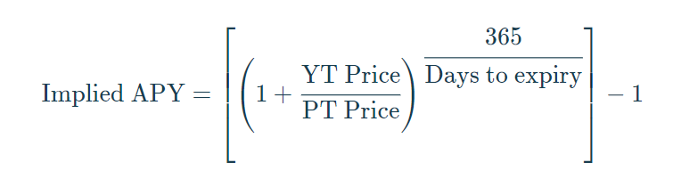 Implied APY:是市场对该资产未来 APY 的共识,反映在 YT 和 PT 资产的价格上,其计算公式为: