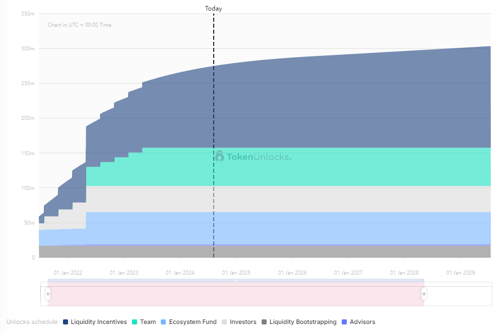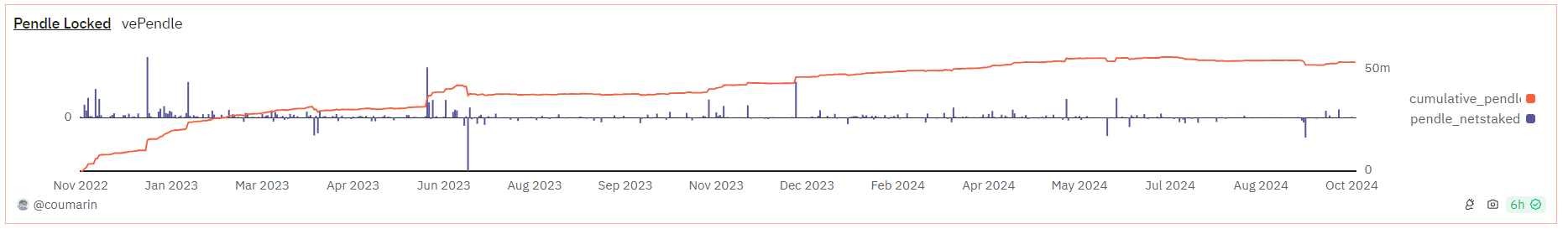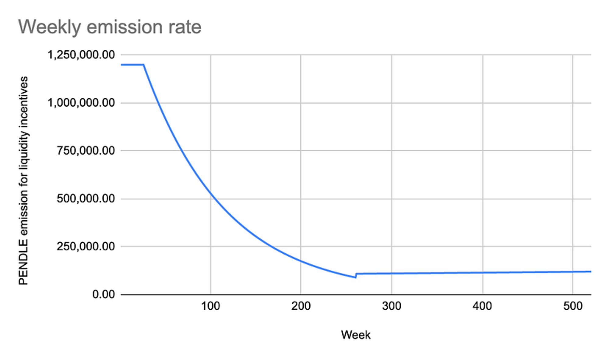 这四个收益率在 Pendle Market 的界面都会同时给出,当 Underlying APY>Implied APY 时,说明持有该资产的收益将大于持有 PT 的收益,此时可以采用做多收益率的策略,即买入 YT、卖出 PT,当 Underlying APY Pendle AMM 用来实现 SY、PT 和 YT 代币之间的交易。根据 Pendle 白皮书,在 V2 版本中,Pendle 改进了 AMM 机制,借鉴了 Notonial Finance 的 AMM 模型,提高了资金效率,降低了滑点。市面上固收类协议的三种 AMM 模型的图示如下,其中 X 轴是指 PT 资产在池子中的比例,纵轴为 Implied Interest Rate,目前 Pendle 采用的是红色曲线对应的 AMM 模型,黑色曲线为 V1 模型,蓝色曲线为其他固收类协议的 AMM 模型。 在具体的池子中,Pendle V2 采用了 PT-SY 的交易对,例如 PT-stETH 和 SY-stETH,可以大大降低 LP 的无常损失(后面会进行详细分析)。由于 SY=PT YT,因此可以通过 Flash Swap 的方式实现 YT 的兑换,具体的流程如下。如用户需要购买价值 1ETH 的 YT-stETH,即需要实现 ETH 到 YT-stETH 的兑换。假设 1ETH=N YT-stETH,合约将从池子中借出 N-1 个 SY-stETH,并将用户的 ETH 转化为 SY-stETH(具体的过程是,先将 ETH 通过 Kyberswap 兑换成 stETH,然后在协议内封装为 SY-stETH),然后将所有的 SY-stETH(N 个)拆分为 PT 和 YT,把适当数量的(在本例中为 N)YT 给用户,然后将 PT(N 个)归还给池子,在池子中实际完成的是 SY-PT(N-1 个 SY 兑换成了 N 个 PT)的兑换。 卖出 YT 的流程则相反。如果用户想要卖出 N 个 YT(假设 N 个 YT 此时的价值为 1 个 SY),合约将从池子中借出 N 个 PT,将其合并为 N 个 SY,并将一个 SY 给用户,N-1 个 SY 归还给池子,此时在池子中实际完成的是 PT-SY 的(N 个 PT 被兑换成了 N-1 个 SY)兑换。 和其他的 AMM 一样,Pendle AMM 同样需要 LP 为池子提供流动性,但由于在到期日,一个 PT 一定等于一个 SY,因此在到期日的时候,LP 不存在无常损失。用户在提供流动性时,提供的资产为 SY 和 PT 资产,因此将自动捕获这部分资产的原生收益,此外还包括交易费和 PENDLE 的流动性挖矿奖励,即包括四项收益来源: PT fixed yield:购买 PT 本身的收益 Underlying yield:即 SY 资产的收益 Swap fees:交易费的 20% PENDLE 代币激励 PENDLE 的代币经济机制主要在于锁仓获取 vePENDLE 后,所能参与的协议分成和决策治理。类似于 Curve 的 veCRV 模型,用户可以将 PENDLE 进行锁仓以换取 vePENDLE,锁仓时间越长,获得的 vePENDLE 的数量越多,锁仓时间从 1 周到 2 年不等。 持有 vePENDLE 的好处包括: Boost 收益:可以对自己作为 LP 的收益进行 Boost,最高额度为 2.5 倍 投票权:对 PENDLE 激励在不同池子中的分配进行投票 收益分成:vePENDLE 的持有者可以获得以下收益: 所投票池子内 80% 的交易费分成:vePENDLE 持有者对 PENDLE 激励的流向进行投票,只有完成投票才能获得所选交易池的奖励 所有 YT 收益的 3% 一部分 PT 的收益:这部分来源于未赎回的 PT,例如⼀个用户购买了 PT 资产,到期时没有赎回,经过⼀段时间后这部分资产被协议获取 在收益率的计算上,持有 vePENDLE 的 Total APY=Base APY Voter’s APY,其中 Base APY 来自 YT 和 PT 的收益,Voter’s APY 来源于指定池子的交易费分成,也是构成 APY 的主要部分——目前 Base APY 仅为 2% 左右,而 Voter’s APY 可高达 30% 及以上。 Pendle 的 ve 模型同样促进了贿选平台的诞生,Penpie 和 Equilibria 都在从事相关的业务,类似于 Convex 与 Curve 之间的业务过程。但相比于 Curve,在 Pendle 上所交易资产的核心项目方并没有贿选的需求,Curve 作为稳定币和其他锚定资产的主要交易平台,保证池子的深度对维持币价的锚定具有重要意义,这促使项目方有极大的需求来参与贿选引导流动性,但保持 Pendle AMM 的交易深度似乎对 LSD 和 LRT 等相关项目方来说没有太多意义,因此参与贿选的主要动力将来源于 Pendle 上的 LP。贿选平台的建立主要优化了两方面的问题:1)Pendle LP 可以不用购买和锁定 PENDLE 来获得更高的收益;2)PENDLE 的持有者可以获得具有流动性的 ePEDNLE/mPENDLE,以获得 vePENDLE 的激励。由于本文仅对 Pendle 进行分析,因此在此处不对贿选生态进行过多展开。 PENDLE 代币于 2021 年 4 月推出,采用混合通胀模型,代币供应无上限,在前 26 周内提供每周 120 万个 PENDLE 的稳定激励,之后(27 周 -260 周),流动性激励将每周衰减 1%,直到第 260 周,此后(261 周以后),通胀率为每年 2%,用于激励。 根据 Token Unlock 数据,初始代币分配给予团队、生态系统、投资者、顾问等,目前全部代币已经完成解锁,如果不考虑 OTC 交易,仅考虑初始分配,PENDLE 未来不会面临大额集中解锁。目前每日通胀仅来自于流动性挖矿激励,每日排放数量约为 34.1k 的 PEDNLE,根据 8 月 5 日币价($2),每日解锁抛压为 $68.2k,抛压比较小。 Pendle 的发展大致可分为三个阶段: Pendle 成立于 2021 年,彼时虽然正值 DeFi Summer,但 DeFi 处于基建期,主要项目围绕着 DEX、稳定币和借贷三大件进行,作为利率交换产品并未得到太多的关注。 直到 2022 年末,随着以太坊完成向 PoS 的转变,以太坊质押利率成为了币圈的原生利率,一众 LSD 资产快速涌现,这造成:(1)利率成为了币圈的关注重点之一;(2)大量生息资产诞生,Pendle 找到了自己的 PMF;(3)Pendle 成为炒作 LSD 赛道的小市值标的,且细分赛道内竞品较少。这一时期上线 Binance 进一步提高了 Pendle 的估值上限。 2023 年末至 2024 年初,Eigenlayer 开启以太坊的再质押叙事,一众流动性再质押(LRT)项目纷纷诞生,Eigenlayer 和 LRT 项目均宣布了积分和空投计划,积分大战一触即发