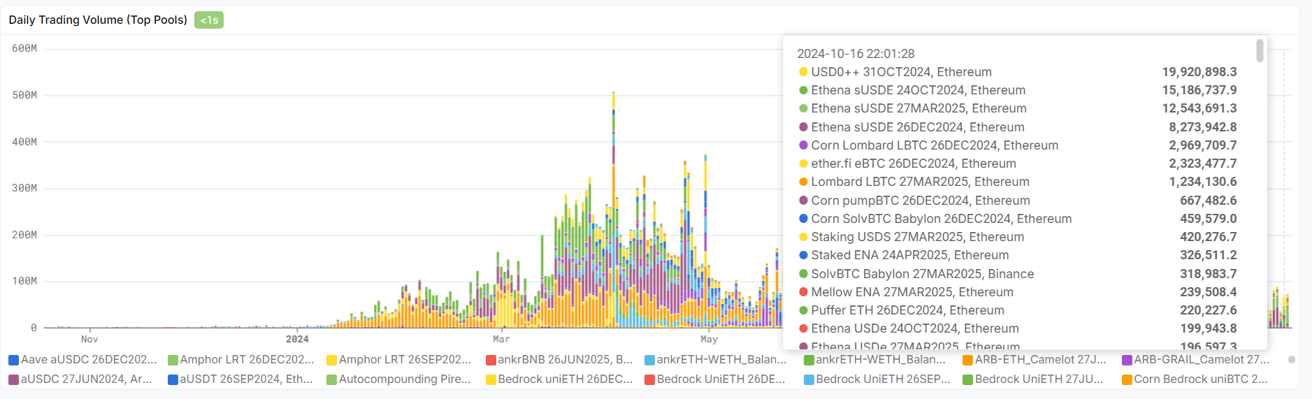 Long Yield APY:专门针对 YT 资产,在当前价格购买 YT 的年收益率,但这一收益率是不断在变化的,因为生息资产本身的收益率在变化(这个值有可能是负数,即当前的 YT 价格过高,导致超过了项目的未来收益)。值得注意的是,目前 Pendle 许多 YT 资产的潜在收益为空投和积分,价值无法估算,因此许多 YT 资产的 Long Yield APY 为 -100%。