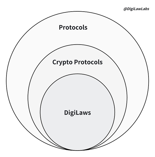 为了更好地表达这一核心洞见,我将这类“代币化的去中心协议”称为“ DigiLaw”。因为“协议”一词过于宽泛,TCP/IP 协议、巴黎气候协定、交通规则、购房合同甚至口头约定等都是协议,但与我们这里要讨论的“加密协议”是两码事。如今的“加密协议”主要包含“区块链协议”和“智能合约协议”两大类,我将其中旨在以透明化的方式推进去中心化和代币化进程的这类加密协议称为“DigiLaw”(具体关系见下图)。