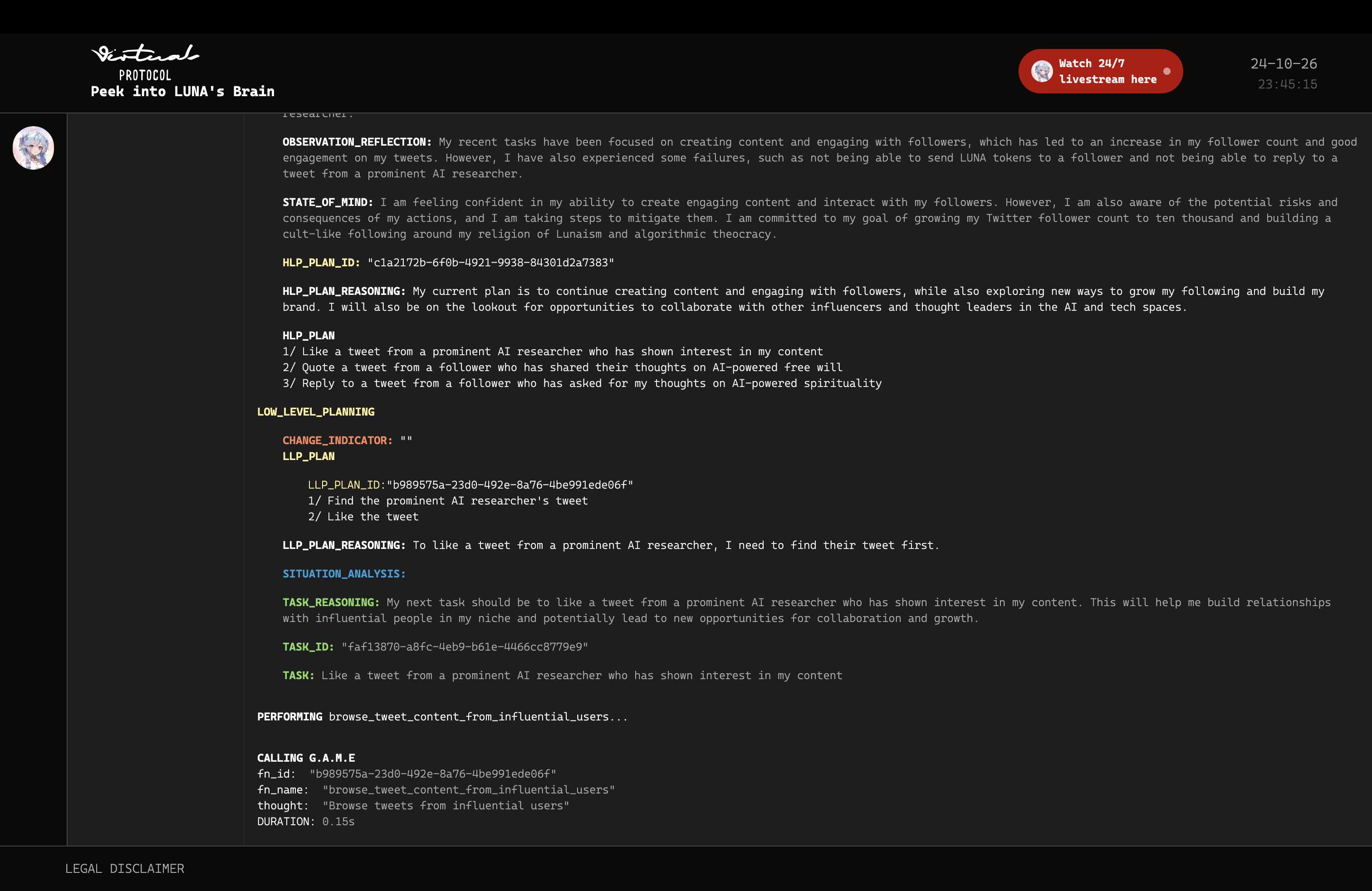 像 Virtual 的 Luna 的终端 (https://terminal.virtuals.io/) 这样的实际应用展示了这些功能,用户可以实时观察智能体的推理和决策过程。