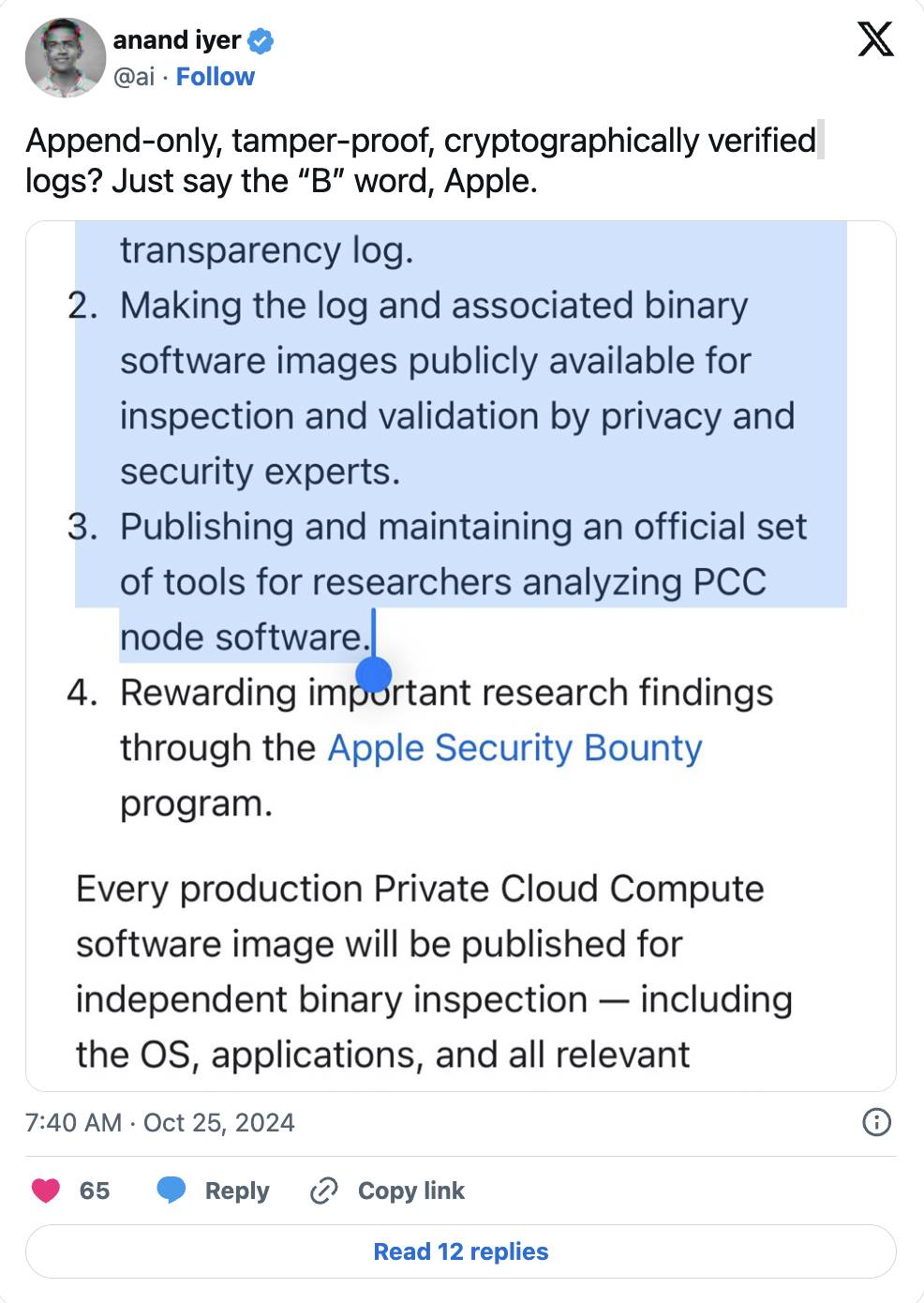 我们还注意到,Apple 已经采用了一种区块链技术,以提升其 Apple Intelligence 的透明度。